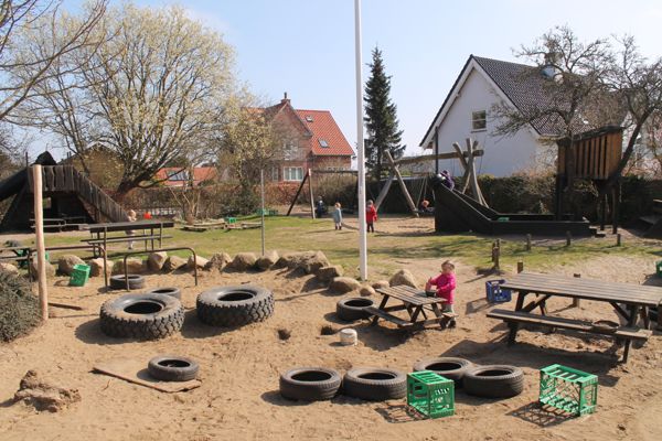 Arken har en dejlig stor legeplads, med enkelte frugttræer og mange buske. Der er en stor græsplæne, en graveplads, sand, vand og nogle gang mudder! Vi har en "skov", hvor der ligger en gammel bunker fra krigens tid. Vi har et legehus, et bålsted, et udendørs værksted/multihus, en motorikbane, en hule i et træ, gynger, en stor sandkasse, et legeredskab med rutschebane, primært til de yngste, og et nyt legeskib - "Arken". Vi har fliser hele vejen rundt om huset og på bagsiden er der indrettet en særlig legeplads til de yngste, samt en "benzin station".